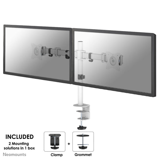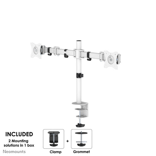 Mit diesem Neomounts Select Monitorarm, Modell NM-D135DWHITE, können Sie zwei Flachbildschirme über eine Tischklemme am Schreibtisch befestigen. Du...
