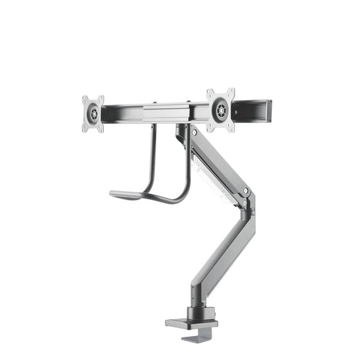 NM-D775DXSILVER ist eine gasgefederte Tischhalterung mit Querstange und Hebel für Flachbildschirme bis zu 32 Zoll (81 cm).