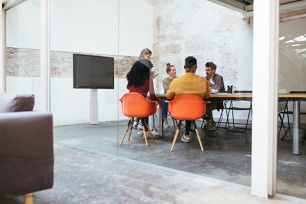 Mit den Neomounts von Newstar PLASMA-W2500SILVER können Sie einen großformatigen Bildschirm auf dem Boden platzieren, beispielsweise in Ihrem Firmeneingang, Klassenzimmer, Sitzungssaal oder Präsentationsraum. Der motorisierte elektrische Bodenlift muss mit den mitgelieferten Wandhalterungen (7 cm Abstand) an der Wand verankert werden. Der PLASMA-W2500SILVER lässt sich ganz einfach per Fernbedienung in der Höhe verstellen. Dank der vier verstellbaren Füße unter der Mittelsäule lässt sich der Ständer perfekt anpassen. Dieses Modell mit einer Höhenverstellung von 50 cm wird in der Farbe RAL 9006 geliefert und ist die beste Wahl, wenn Sie die Höhe eines großformatigen Flachbildschirms einfach und automatisch verstellen möchten. Der PLASMA-W2500SILVER ist für Bildschirme von 42“ bis 100“ geeignet und hat eine Tragkraft von 150 kg. Die Halterung ist für Bildschirme mit einem VESA-Lochmuster von 200x200 bis 800x600 mm geeignet. Der Abstand vom Boden zur Bildschirmmitte lässt sich stufenlos von 119 bis 169 cm einstellen. Hinter dem Bildschirm steht ein 6 cm tiefer Raum zur Verfügung, beispielsweise für einen Mediaplayer. Dieses hochwertige Produkt wird komplett mit Installationsmaterial und einer 5-Jahres-Garantie geliefert.